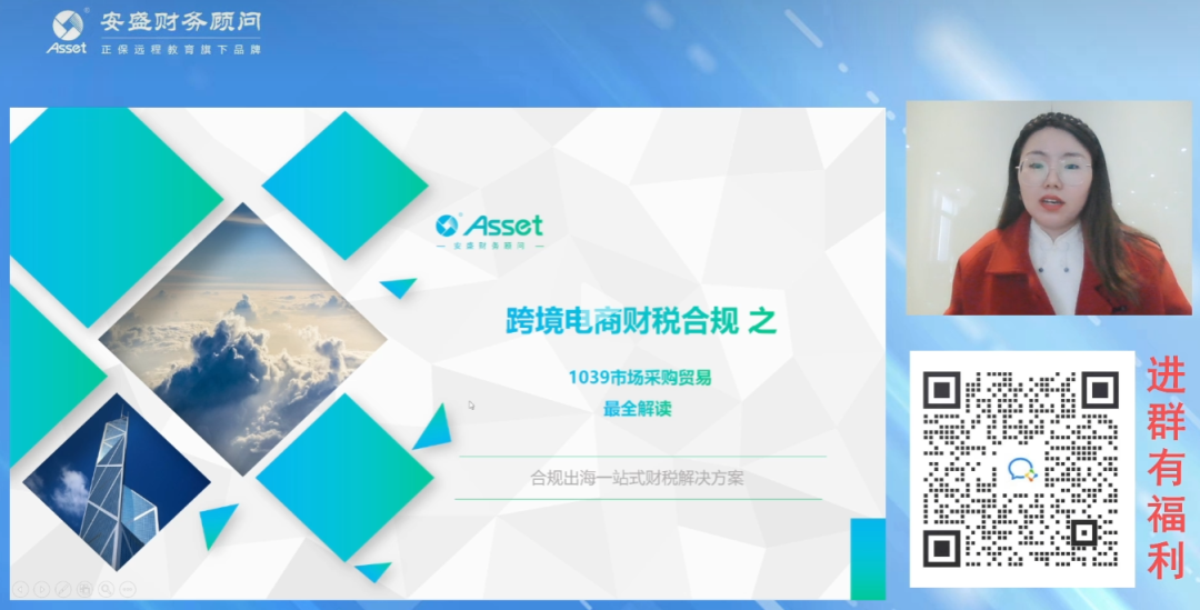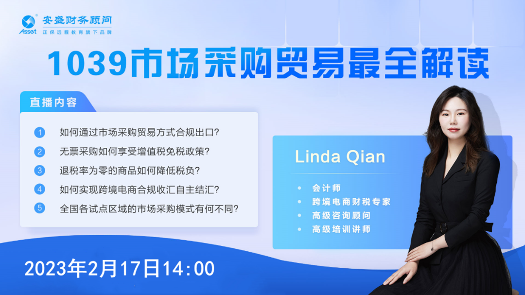 為了幫助跨境電商企業(yè)更全面地理解1039市場(chǎng)采購貿(mào)易,2月17日14時(shí),安盛財(cái)務(wù)組織開展“安盛財(cái)稅云課堂”第四期——線上直播培訓(xùn)課《1039市場(chǎng)采購貿(mào)易最全解讀》,活動(dòng)邀請(qǐng)咨詢顧問中心Linda老師給大家?guī)砭手v解。